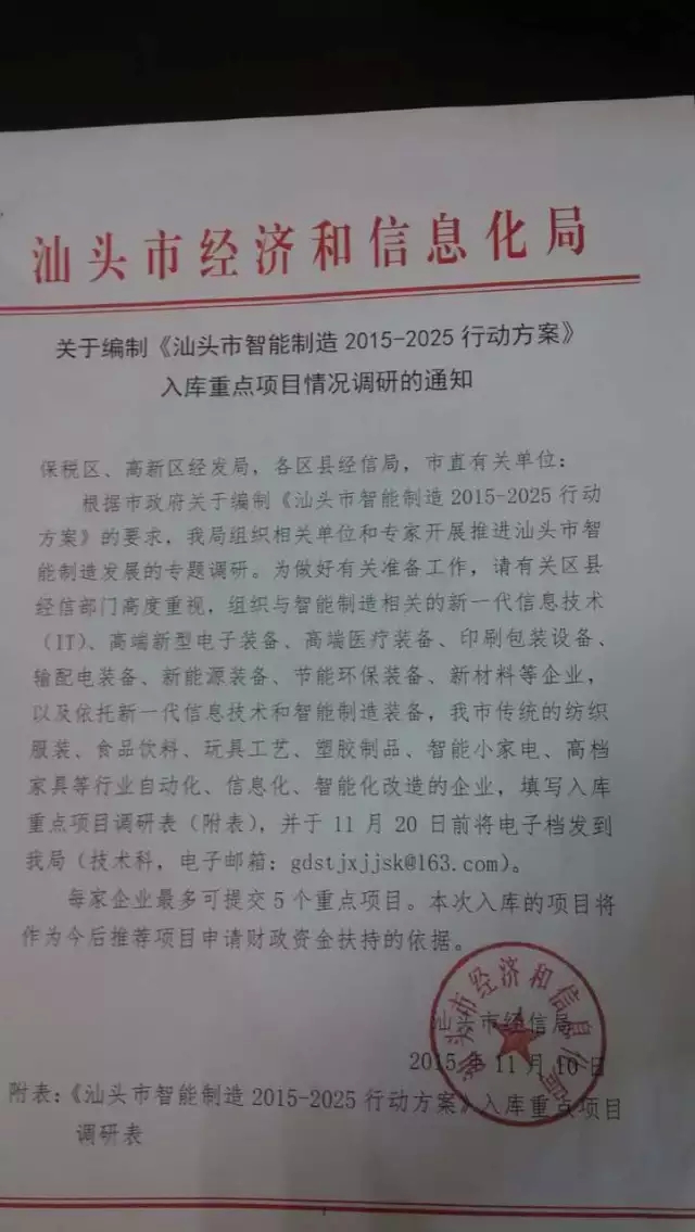 汕头市经信局正制定汕头市智能制造的行动方案,正征集相关的入库项目。这些项目将会成为今后市级及推荐省级技改项目的重点对象。